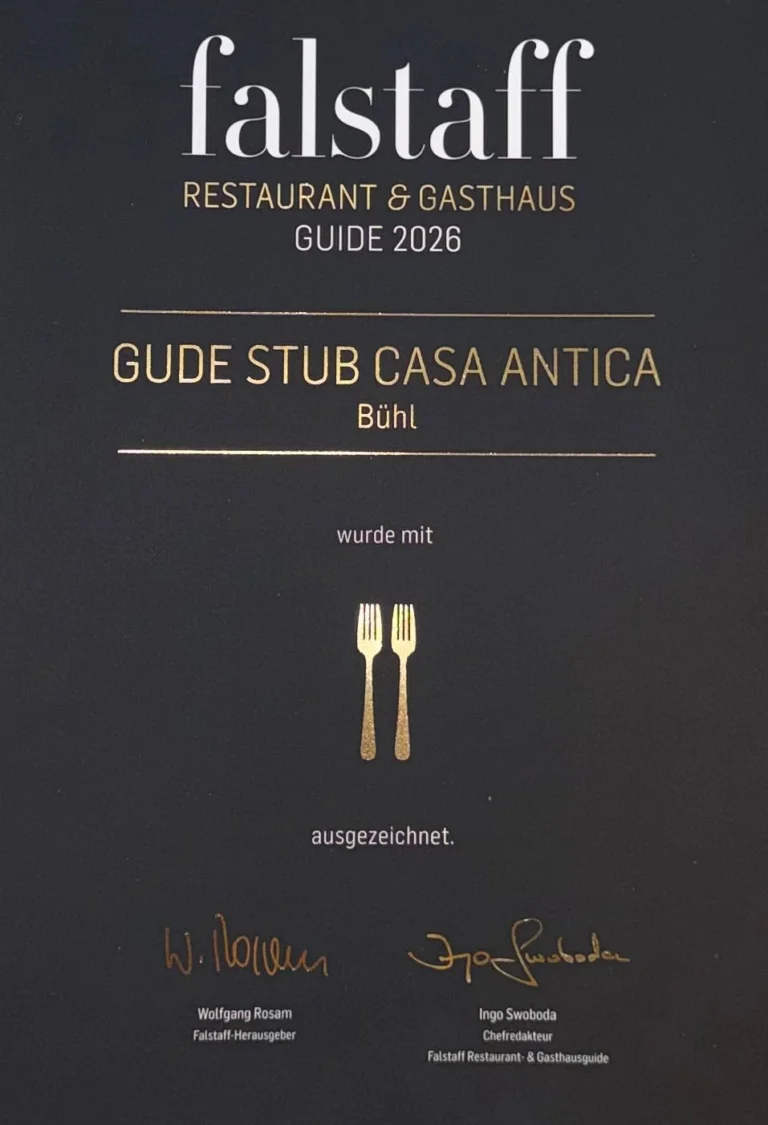 „In der „Gude Stub Casa Antica“ fühlt man sich als Gast sofort wohl. Das liegt am behaglichen Interieur, der herzlichen Gastfreundschaft und vor allem an der authentischen italienischen Küche von Patron Andrea Alesi. Brot, Schinken und Pasta werden selbst hergestellt, exzellente Fischzubereitungen gehören zu den Spezialitäten des Hauses.“