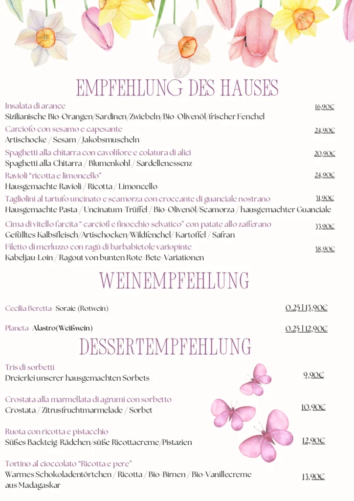 Begleitet wird die Degustation von einem sorgfältig abgestimmten Menü, das die Aromen und Charaktere der ausgewählten Weine perfekt ergänzt. Jeder Gang ist darauf ausgelegt, die Vielfalt und Eleganz der Weine hervorzuheben und Ihnen ein harmonisches Geschmackserlebnis zu bieten.
