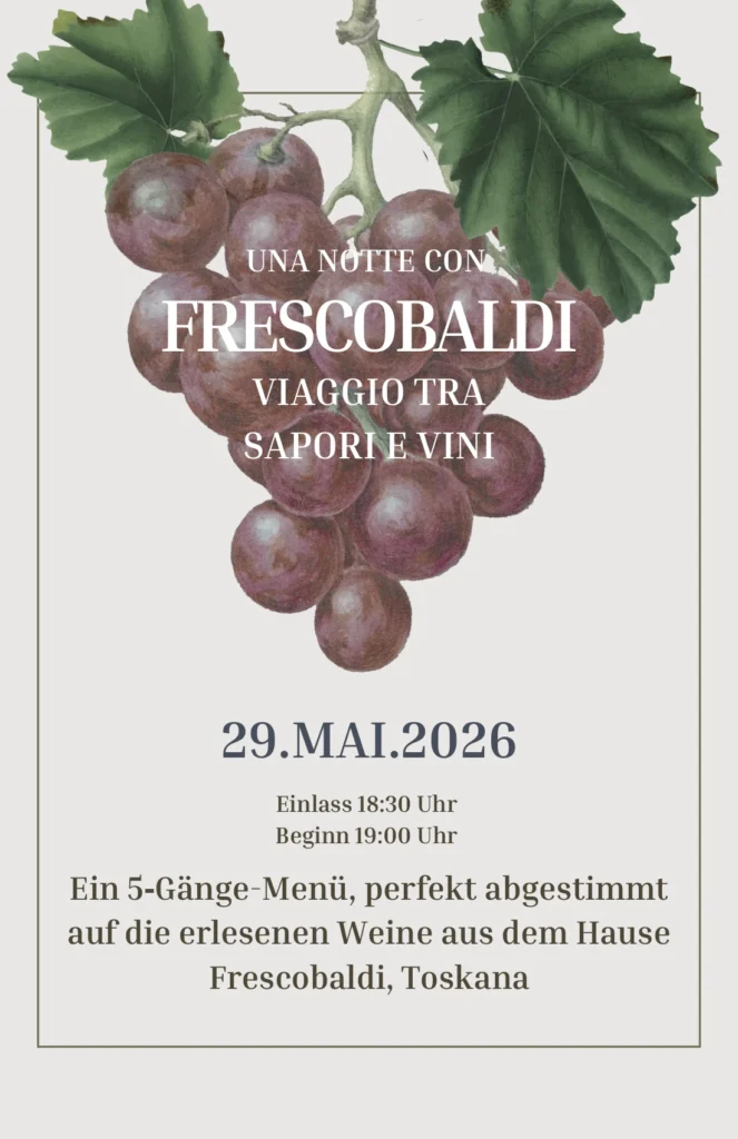 Freuen Sie sich auf eine exklusive Wein-Degustation mit dem traditionsreichen Weingut Marchesi Frescobaldi aus der Toskana. Seit über 700 Jahren steht Frescobaldi für höchste Qualität, Leidenschaft und die authentische Ausdruckskraft toskanischer Weinkultur.